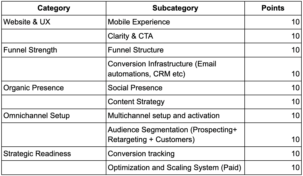 Here’s a scoring system that you can use to see your readines. The scoring system is broken into segments , and a maximum of 10 points to be assigned to each and the total score should tell you the readiness of starting your paid advertising campaigns.